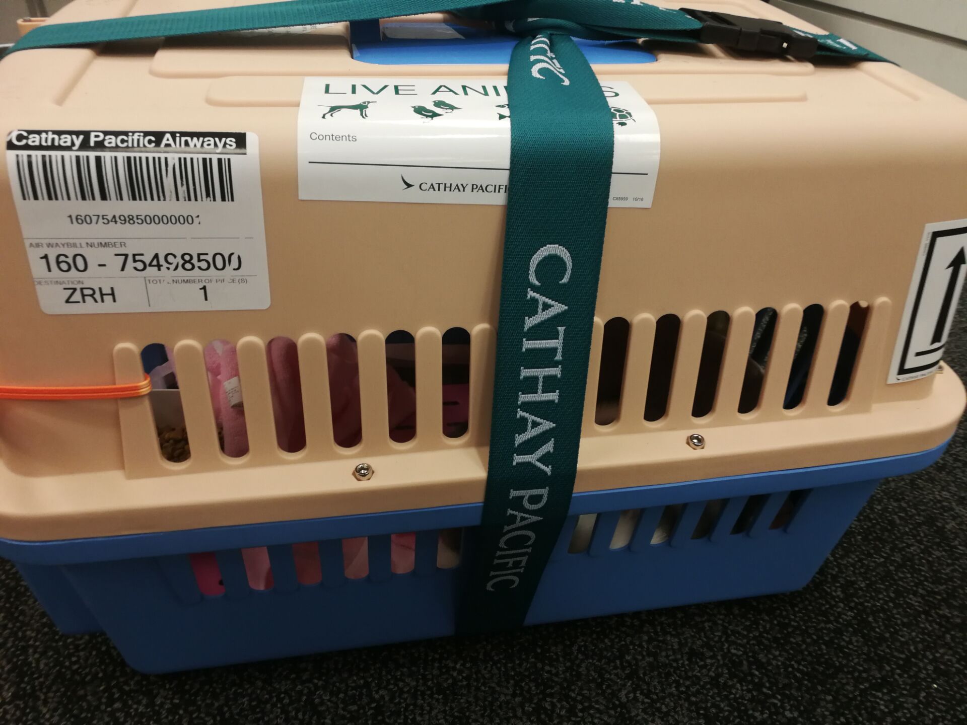 猫猫提前由武汉空运到深圳,由深圳到香港,最后从香港机场直飞苏黎世机场。整个过程我一直很担心,害怕猫猫在途中的安全和食宿,还好托运公司能够时时的提供猫猫视频,看到猫猫照顾的好好的才放心了。由于10月底苏黎世已经很冷了,托运公司很贴心的准备了2条毛毯保暖。
